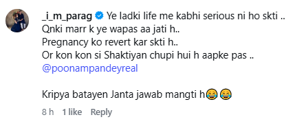 1 अप्रैल को पूनम ने इंस्टाग्राम पर एक वीडियो शेयर किया और लोगों के सवालों का जवाब दिया. उन्होंने अपने फॉलोअर्स को बताया कि वह प्रेग्नेंट नहीं हैं और यह पोस्ट सिर्फ एंटरटेनमेंट के लिए किया गया था. उन्होंने कहा, “दोस्तों, आपकी शुभकामनाओं के लिए बहुत धन्यवाद. लेकिन मैं प्रेग्नेंट नहीं हूं. आज अप्रैल फूल डे है, यह बस एक प्रैंक था.”