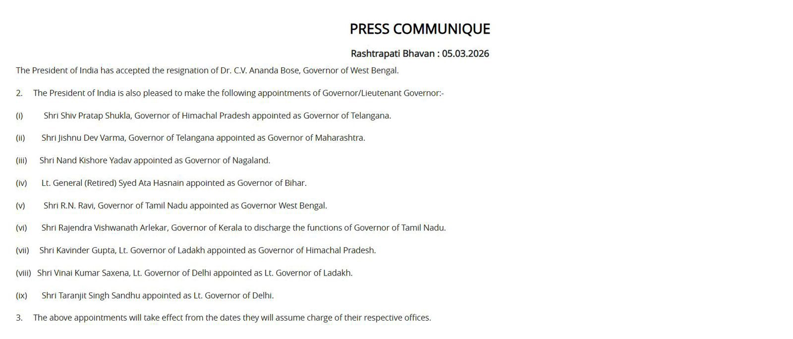 तबादले की लिस्ट की माने तो, तेलंगाना के राज्यपाल जिष्णु देव वर्मा को अब महाराष्ट्र का कार्यभार सौंपा गया है. वर्मा त्रिपुरा के पूर्व उपमुख्यमंत्री रह चुके हैं और राज्य के शाही परिवार से ताल्लुक रखते हैं. हिमाचल प्रदेश के राज्यपाल रहे शिव प्रताप शुक्ला को अब तेलंगाना भेजा गया है. केरल के राज्यपाल राजेंद्र विश्वनाथ अर्लेकर को अब तमिलनाडु के राज्यपाल के कार्यों का अतिरिक्त प्रभार सौंपा गया है.