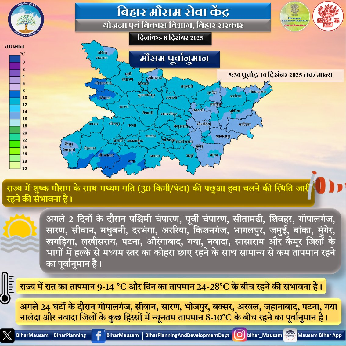अगले 24 घंटे में गोपालगंज, सीवान, सारण, भोजपुर, बक्सर, अरवल, जहानाबाद, पटना, गया, नालंदा और नवादा जिलों में न्यूनतम तापमान 8 से 10 डिग्री सेल्सियस तक पहुंच सकता है. ऐसे मौसम में सावधानी बरतने की सलाह दी गई है. बिहार में आने वाले दिनों में शुष्क मौसम, तेज पछुआ हवा, कोहरे और गिरते तापमान के साथ ठंड का असर और अधिक महसूस होगा.