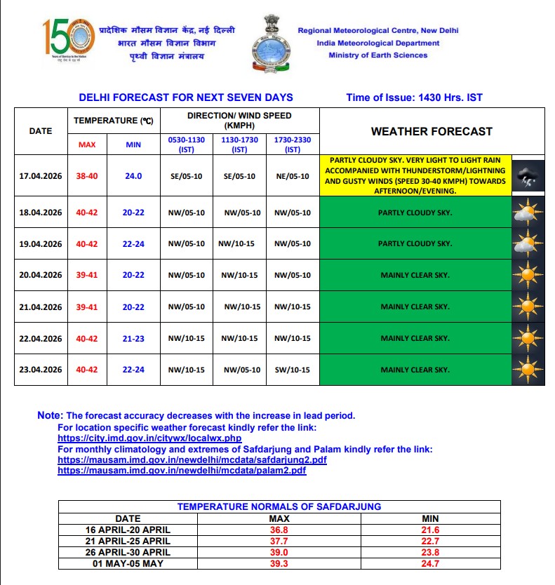 पूर्वानुमान के अनुसार दिल्ली में अगले सात दिनों में गर्मी का असर बना रहेगा. 18 और 19 अप्रैल को हल्के बादल रहेंगे, लेकिन बारिश की संभावना कम है. 20 अप्रैल से 23 अप्रैल तक मौसम मुख्यतः साफ रहेगा और तापमान धीरे-धीरे बढ़कर अधिकतम 40-42°C तक पहुंच सकता है, जबकि न्यूनतम तापमान 20-24°C के बीच रहेगा.