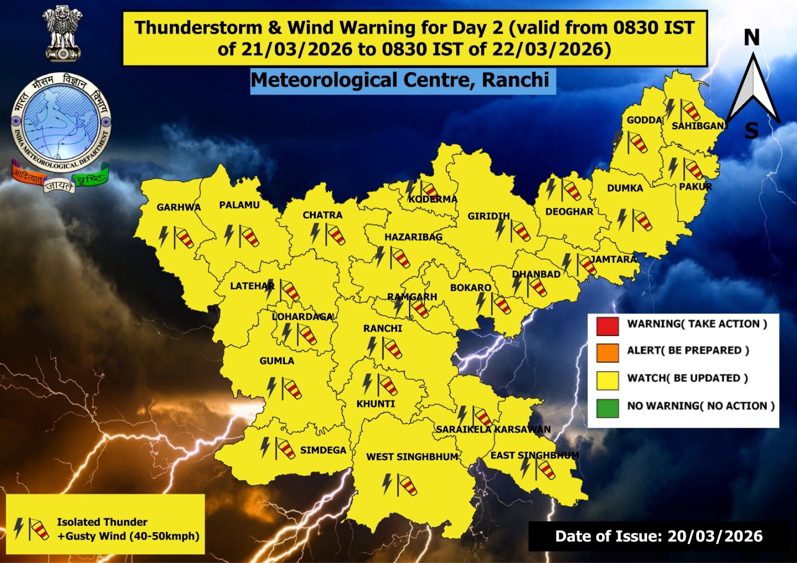 झारखंड में 21 मार्च की सुबह से 22 मार्च तक कई जिलों में मौसम खराब रहने वाला है. राज्य के लगभग सभी हिस्सों में गरज-चमक के साथ बारिश और तेज हवाएं (40-50 किमी/घंटा) चलने की संभावना है. रांची, बोकारो, धनबाद, देवघर, दुमका, गिरिडीह समेत ज्यादातर जिलों में बिजली गिरने और आंधी का अलर्ट है.