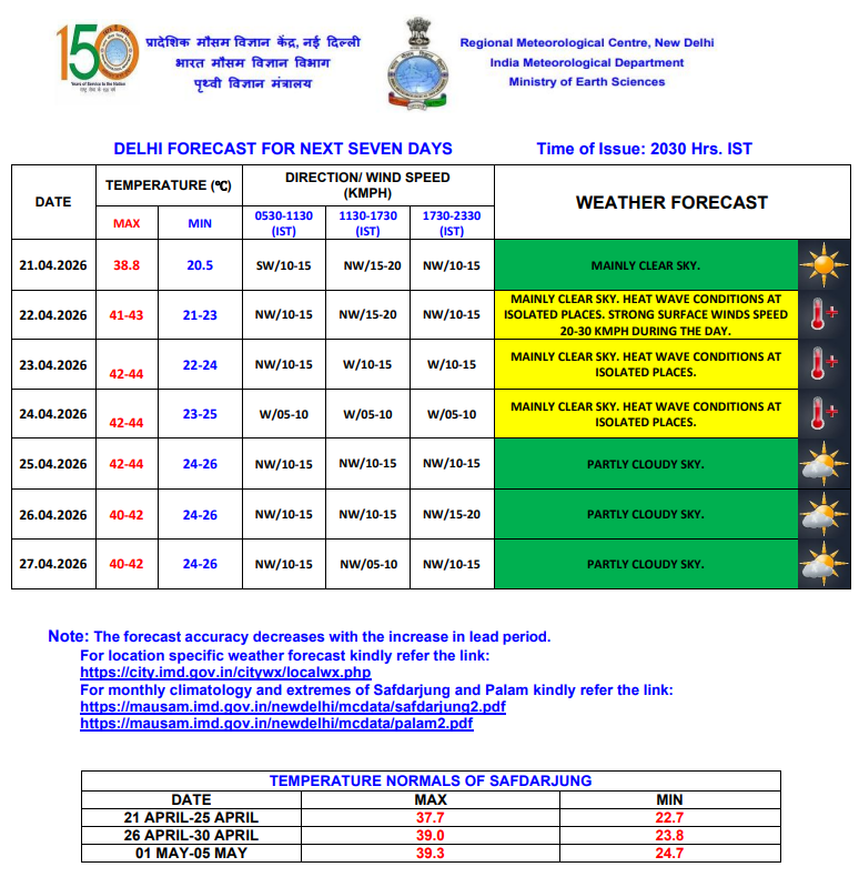दिल्ली में अगले सात दिनों तक मौसम ज्यादातर साफ और गर्म रहने वाला है. 22 से 24 अप्रैल के बीच कई जगहों पर लू चलने की संभावना है और तापमान 42-44 डिग्री तक पहुंच सकता है. दिन में तेज गर्म हवाएं भी चलेंगी. 25 अप्रैल के बाद हल्के बादल छाए रह सकते हैं, लेकिन गर्मी से खास राहत नहीं मिलेगी और तापमान 40 डिग्री के आसपास बना रहेगा.