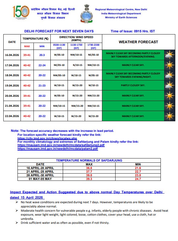 पूर्वानुमान के अनुसार दिल्ली में अगले सात दिनों तक मौसम ज्यादातर साफ रहेगा, बीच-बीच में हल्के बादल छा सकते हैं. अधिकतम तापमान 39 से 42 डिग्री सेल्सियस के बीच रहने की संभावना है, जबकि न्यूनतम तापमान 20 से 24 डिग्री के आसपास रहेगा. कुल मिलाकर, दिल्ली में गर्मी का असर बना रहेगा और तापमान सामान्य से थोड़ा ज्यादा रह सकता है.