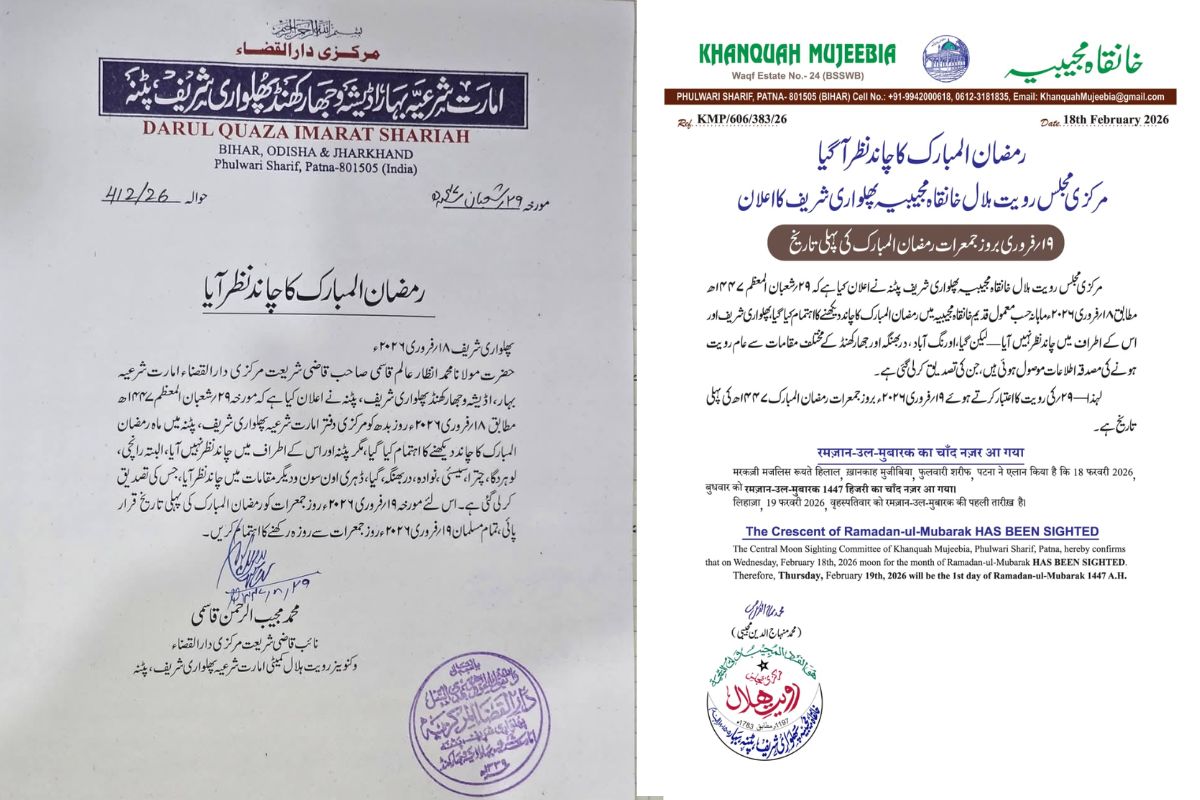Ramzan 2026: इस्लामिक कैलेंडर के सबसे पवित्र महीने रमजान उल मुबारक का चांद बुधवार की शाम देश के विभिन्न हिस्सों में नजर आ गया. चांद दिखने की तस्दीक होते ही गुरुवार से रमजान के मुकद्दस महीने की शुरुआत हो गई और गुरुवार की सुबह से पहला रोजा रखा जाएगा. रमजान माह का मुकद्दस चांद बिहार के गया, नवादा, समस्तीपुर के मुसरी घरारी, दरभंगा तथा झारखंड के रांची, लोहरदगा, चतरा सहित असम और देश के विभिन्न हिस्सों में देखे जाने की सूचना मिलने के बाद बिहार, झारखंड और उड़ीसा के मुसलमानों की सबसे बड़ी एदारा इमारत ए शरिया तथा प्रसिद्ध खानकाह मुजीबिया सहित तमाम मुस्लिम एदारों ने ऐलान किया कि रमजान मुबारक का पहला रोजा गुरुवार से शुरू होगा.