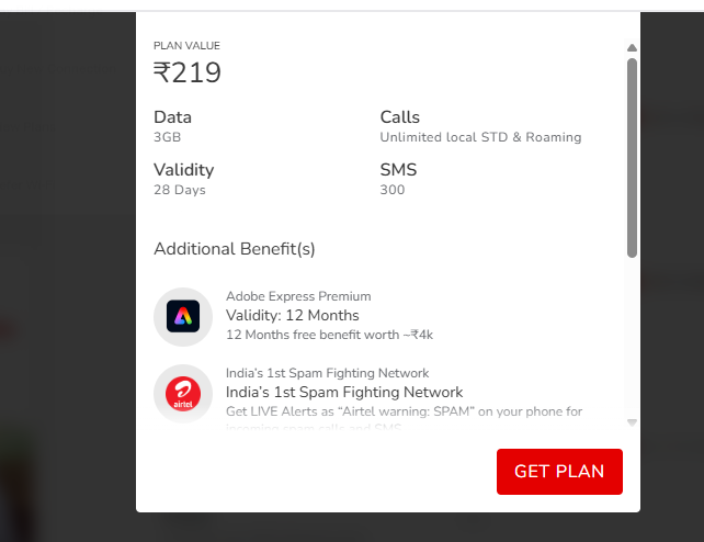एयरटेल के 219 रुपये वाले प्लान में 28 दिनों की वैलिडिटी मिल रही है. इसमें अनलिमिटेड कॉलिंग और 300 फ्री SMS का फायदा मिलेगा. हालांकि, इस प्लान में कंपनी सिर्फ 3GB डेटा दे रही है. इसके अलावा, पूरे सालभर के लिए Adobe Express Premium का फ्री एक्सेस, Airtel Xstream Play (Free content) का सब्सक्रिप्शन, फ्री हेलोट्यून्स और स्पैम अलर्ट का फायदा भी दे रही है.