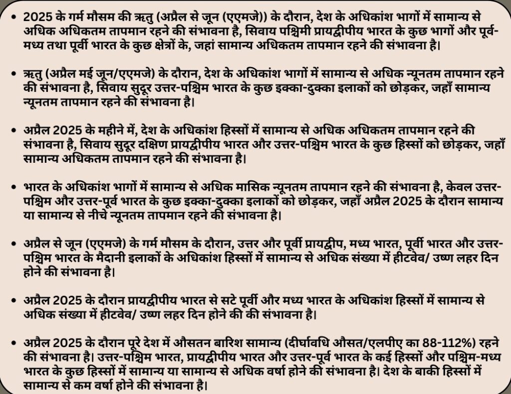 Weather Forecast: मार्च का महीना खत्म हो गया है. कल से नया महीना शुरू हो रहा है. अप्रैल में कुछ बदले न बदले मौसम का मिजाज जरूर बदलने वाला है. आईएमडी का अनुमान है कि अगले दो महीने यानी अप्रैल और मई में भीषण गर्मी पड़ सकती है. कई इलाकों में लू चलेगी. मौसम विभाग ने भीषण गर्मी और हीट वेव को लेकर अलर्ट जारी किया है. आईएमडी के मुताबिक देश में अप्रैल से जून तक तापमान सामान्य से अधिक रह सकता है. इसके अलावा मध्य और पूर्वी हिंदुस्तान और उत्तर-पश्चिमी मैदानी इलाकों में लू चल सकती है. सामान्य से अधिक रहेगा तापमान आईएमडी के प्रमुख मृत्युंजय महापात्रा ने मीडिया से बात करते हुए कहा कि पश्चिमी और पूर्वी हिंदुस्तान के कुछ क्षेत्रों को छोड़कर देश के अधिकांश हिस्सों में अधिकतम तापमान सामान्य से अधिक रहेगा. उन्होंने कहा कि अधिकांश क्षेत्रों में न्यूनतम तापमान भी सामान्य से अधिक रहने की संभावना है. महापात्रा ने कहा “अप्रैल से जून तक उत्तर और पूर्वी हिंदुस्तान के अधिकांश हिस्सों, मध्य हिंदुस्तान और उत्तर-पश्चिम हिंदुस्तान के मैदानी इलाकों में सामान्य से दो से चार दिन अधिक लू चलने की संभावना है.” उन्होंने बताया कि आमतौर पर हिंदुस्तान में अप्रैल से जून तक चार से सात दिन तक लू चलती है. गर्म मौसम की ऋतु (अप्रैल से जून) 2025 के लिए अद्यतन ऋतुनिष्ठ आउटलुक और अप्रैल 2025 के लिए वर्षा और तापमान हेतु मासिक आउटलुक अधिक जानकारी के लिए, लिंक पर जाइए: https://t.co/yxXYQYsKQY… #imd #weatherupdate #mausam #outlook #season #temperatures@moesgoi @ndmaindia… pic.twitter.com/ZtzHabxP2L — India Meteorological Department (@Indiametdept) March 31, 2025 उत्तर हिंदुस्तान के इन राज्यों में सबसे ज्यादा असर मौसम विभाग ने बताया है कि आने वाले समय में दिल्ली से लेकर उत्तर हिंदुस्तान के कई और राज्यों में मौसम करवट लेगा. कई राज्यों में सामान्य से अधिक दिन लू चलने की संभावना है. उत्तर प्रदेश, बिहार, झारखंड, पश्चिम बंगाल, ओडिशा, छत्तीसगढ़, राजस्थान, गुजरात, हरियाणा, पंजाब, मध्यप्रदेश के साथ-साथ महाराष्ट्र, तेलंगाना, आंध्र प्रदेश, कर्नाटक और तमिलनाडु में भीषण गर्मी और लू का प्रकोप दिखेगा. Weather forecast: अप्रैल और मई में पड़ेगी भीषण गर्मी, imd का हीट वेव अलर्ट, वीकेंड में तपती रहेगी दिल्ली-यूपी 2 इन राज्यों में 10 से 11 दिन चलेगी लू आईएमडी प्रमुख महापात्रा ने बताया कि अप्रैल से जून तक उत्तर और पूर्वी हिंदुस्तान के अधिकांश हिस्सों, मध्य हिंदुस्तान और उत्तर-पश्चिम हिंदुस्तान के मैदानी इलाकों में सामान्य से दो से चार दिन अधिक लू चलने की संभावना है. जिन राज्यों में सामान्य से अधिक दिन लू चलने की संभावना है उनमें राजस्थान, गुजरात, हरियाणा, पंजाब, मध्य प्रदेश, महाराष्ट्र, उत्तर प्रदेश, बिहार, झारखंड, पश्चिम बंगाल, ओडिशा, छत्तीसगढ़, तेलंगाना, आंध्र प्रदेश तथा कर्नाटक और तमिलनाडु के उत्तरी ह