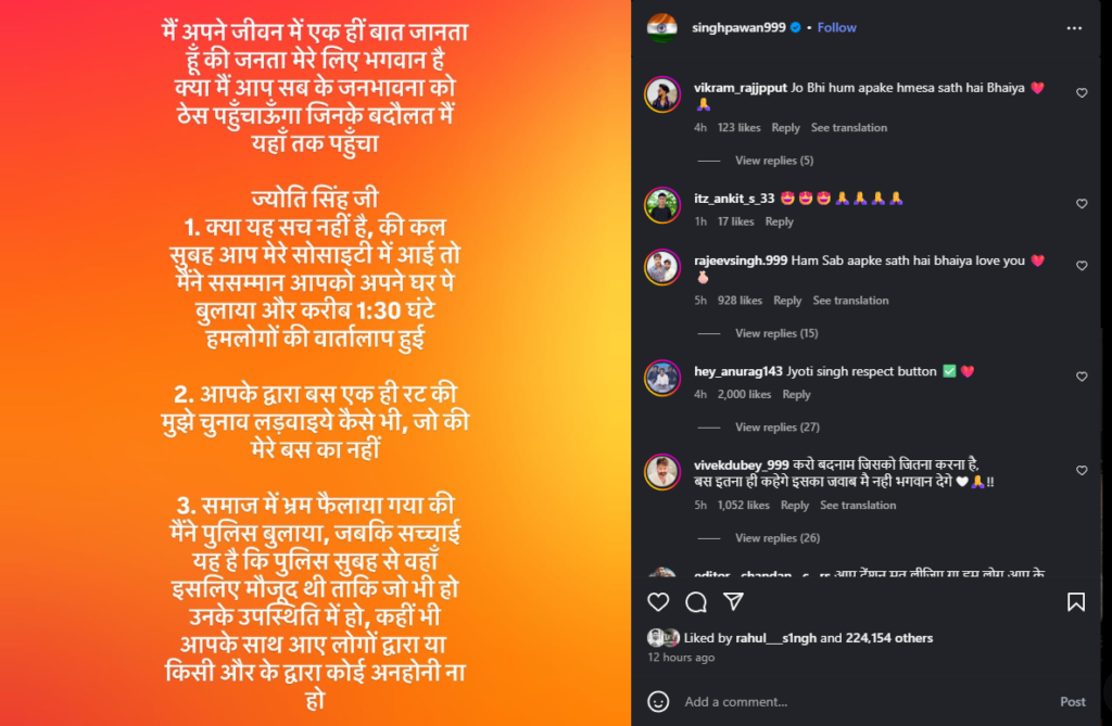 Pawan Singh-Jyoti Controversy: भोजपुरी सुपरस्टार पवन सिंह एक बार फिर सुर्खियों में हैं, लेकिन इस बार वह कोई फिल्म को लेकर नहीं, बल्कि अपनी पर्सनल लाइफ को चर्चा बटोर रहे हैं. दरअसल उनकी पत्नी ज्योति सिंह ने उनपर कई तरह के आरोप लगाए हैं, जिसमें उनसे ना मिलना शामिल है. हाल ही में मामले ने तब तूल पकड़ा, जब ज्योति सिंह उनके लखनऊ स्थित घर पर पहुंची, लेकिन पुलिस वाले उन्हें रोकते हुए दिखाई दिए, जिसके बाद पावर स्टार की वाइफ फूट-फूटकर रोती दिखाई दी. उन्होंने जनता से मदद मांगी. अब पूरे मामले पर पवन सिंह सफाई दी है. ज्योति सिंह के आरोपों पर फाइनली पवन सिंह ने तोड़ी चुप्पी पवन सिंह ने इंस्टाग्राम अकाउंट पर एक लंबा नोट शेयर किया, जिसमें ज्योति की ओर से लगाए गए आरोपों पर बात की. उन्होंने लिखा, “मैं अपनी लाइफ में बस एक ही बात जानता हूं कि पब्लिक मेरे लिए भगवान है. मैं आप लोगों के दिल को कभी ठेस नहीं पहुंचाऊंगा, क्योंकि आपकी मदद से ही मैं यहां तक पहुंचा हूं. ज्योति सिंह जी… क्या यह सच नहीं है कि जब आप मेरी सोसाइटी में आई तो, मैंने आपको सम्मानपूर्वक घर में बुलाया था और हमने करीब डेढ़ घंटे बात की थी. हालांकि आपने मुझसे एक ही बात की, जिसमें चुनाव लड़ना था. हालांकि यह मेरे वश में नहीं है.” पुलिस बुलाने वाले बात पर क्या बोले पवन सिंह पुलिस वाले बात पर पवन सिंह ने आगे कहा, मेरे घर पर पुलिस अधिकारी सुबह से ही थे, क्योंकि मैं चाहता था कि जो भी हो उनकी मौजूदगी में हो. हालांकि समाज में यह फैलाया गया कि मैंने पुलिस बुलाया है, हालांकि ऐसा कुछ भी नहीं है. Pawan singh-jyoti controversy: पवन सिंह ने पत्नी की ओर से लगाए गए गंभीर आरोपों पर तोड़ी चुप्पी, कहा- एक ही बात जानता हूं 2 ज्योति सिंह ने वीडियो शेयर कर क्या कहा था दरअसल ज्योति सिंह की ओर से शेयर किए वीडियो में वह कहती नजर आई कि वह अपने पति से मिलने के लिए आई थी, लेकिन घर के प्रवेश द्वार पर उन्हें पुलिस अधिकारियों की ओर से रोका जा रहा है. दरअसल पवन सिंह ने साल 2022 में आरा फैमिली कोर्ट में तलाक की अर्जी दी थी. ज्योति ने शुरुआत में 5 लाख रुपये मासिक गुजारा भत्ता मांगा था, लेकिन वह इस बात पर जोर देती रही कि पैसे या संपत्ति से ज्यादा, वह बस अपने पति से बातचीत करना चाहती हैं. यह भी पढ़ें- Sunny Sanskari Ki Tulsi Kumari Box Office Collection Day 6: पास या फेल, छठे दिन वरुण धवन की फिल्म ने किया महज इतना कलेक्शन The post Pawan Singh-Jyoti Controversy: पवन सिंह ने पत्नी की ओर से लगाए गए गंभीर आरोपों पर तोड़ी चुप्पी, कहा- एक ही बात जानता हूं appeared first on Naya Vichar.