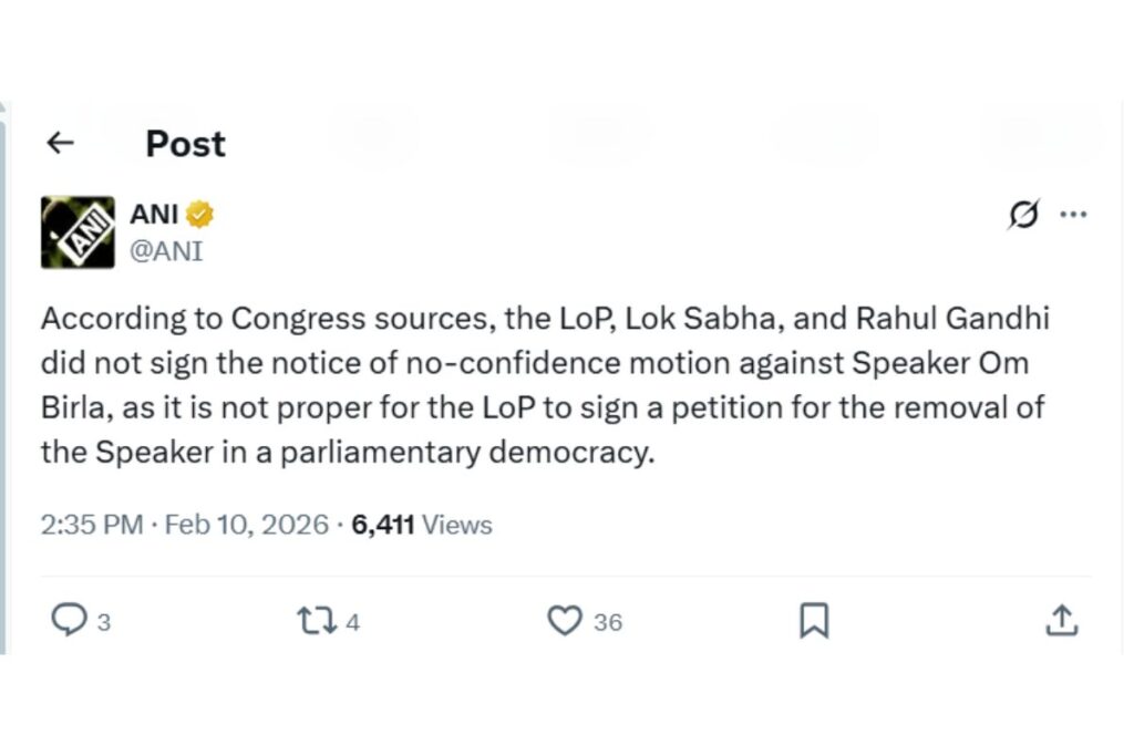 नोटिस पर कांग्रेस, समाजवादी पार्टी, द्रमुक और कई अन्य विपक्षी दलों के कुल 118 सांसदों ने साइन किए हैं. लोकसभा महासचिव को नोटिस सौंपे जाने के बाद ओम बिरला ने खुद को सदन की कार्यवाही से अलग कर लिया और आसन पर नहीं बैठे. राहुल गांधी ने नोटिस पर क्यों नहीं किया साइन? न्यूज एजेंसी एएनआई ने कांग्रेस सूत्रों के हवाले से बताया, लोकसभा के LoP और राहुल गांधी ने स्पीकर ओम बिरला के खिलाफ नो-कॉन्फिडेंस मोशन के नोटिस पर साइन नहीं किया, क्योंकि संसदीय लोकतंत्र में LoP के लिए स्पीकर को हटाने की पिटीशन पर साइन करना सही नहीं है. According to Congress sources, the LoP, Lok Sabha, and Rahul Gandhi did not sign the notice of no-confidence motion against Speaker Om Birla, as it is not proper for the LoP to sign a petition for the removal of the Speaker in a parliamentary democracy. — ANI (@ANI) February 10, 2026 नो-कॉन्फिडेंस मोशन में क्या कहा गया? कांग्रेस की तरफ से लोकसभा स्पीकर ओम बिरला के खिलाफ पेश किए गए नो-कॉन्फिडेंस मोशन में कहा गया है, हिंदुस्तान के संविधान के आर्टिकल 94(c) के नियमों के तहत, ओम बिरला को लोकसभा स्पीकर के पद से हटाने के लिए एक प्रस्ताव का नोटिस इसलिए दिया गया है क्योंकि वह लोकसभा का काम खुलेआम एकतरफा तरीके से कर रहे हैं. कई मौकों पर, विपक्षी पार्टियों के नेताओं को बोलने नहीं दिया गया, जो संसद में उनका बुनियादी लोकतांत्रिक अधिकार है. राहुल गांधी ने नोटिस पर साइन नहीं किया, फोटो एक्स नियमों के अनुसार कार्रवाई की जाएगी : लोकसभा सचिवालय लोकसभा सचिवालय के सूत्रों ने विपक्ष का नोटिस मिलने की बात स्वीकार करते हुए कहा कि इस पर विचार किया जाएगा और नियमों के अनुसार कार्रवाई की जाएगी. निचले सदन में कांग्रेस के उप नेता गौरव गोगोई, कांग्रेस के मुख्य सचेतक कोडिकुनिल सुरेश और सचेतक मोहम्मद जावेद ने लोकसभा महासचिव उत्पल कुमार सिंह को यह नोटिस सौंपा. The opposition on Tuesday submitted a notice for moving a resolution to remove Lok Sabha Speaker Om Birla from office for disallowing Rahul Gandhi and other opposition leaders from speaking in the House on the Motion of Thanks to the President’s address, as well as for the… pic.twitter.com/GqIMJCjhMX — Press Trust of India (@PTI_News) February 10, 2026 तृणमूल कांग्रेस के सांसदों ने नोटिस पर नहीं किया साइन अविश्वास प्रस्ताव के मुद्दे पर भी विपक्षी एकता को झटका लगा है. तृणमूल कांग्रेस के सांसदों ने इस नोटिस पर हस्ताक्षर नहीं किए हैं. संविधान के अनुच्छेद 94 (सी) के तहत नोटिस दिया गया कांग्रेस सांसद गोगोई ने कहा कि लोकसभा महासचिव को संविधान के अनुच्छेद 94 (सी) के तहत यह प्रस्ताव संबंधी नोटिस सौंपा गया है. विपक्ष ने नोटिस में कहा, बीते दो फरवरी को लोकसभा में विपक्ष के नेता राहुल गांधी को राष्ट्रपति के अभिभाषण पर धन्यवाद प्रस्ताव पर बोलते समय अपना भाषण पूरा नहीं करने दिया गया. यह कोई अकेली घटना नहीं है. करीब-करीब हमेशा ही ऐसा होता है कि लोकसभा में विपक्ष के नेता को बोलने नहीं दिया जाता. उन्होंने दावा किया कि गत 3 फरवरी को, विपक्ष के आठ सांसदों को पूरे बजट 