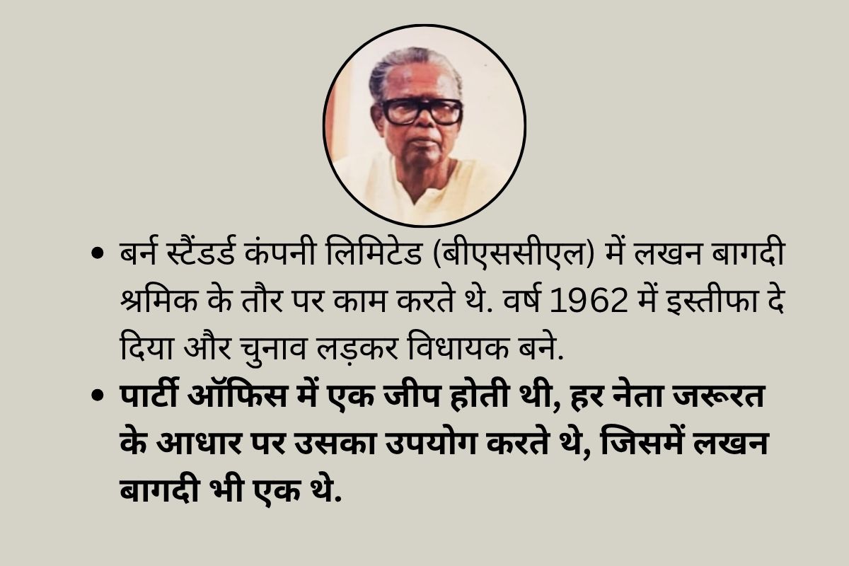 • बर्न स्टैंडर्ड कंपनी लिमिटेड (बीएससीएल) में लखन बागदी श्रमिक के तौर पर काम करते थे. वर्ष 1962 में इस्तीफा दे दिया और चुनाव लड़कर विधायक बने.