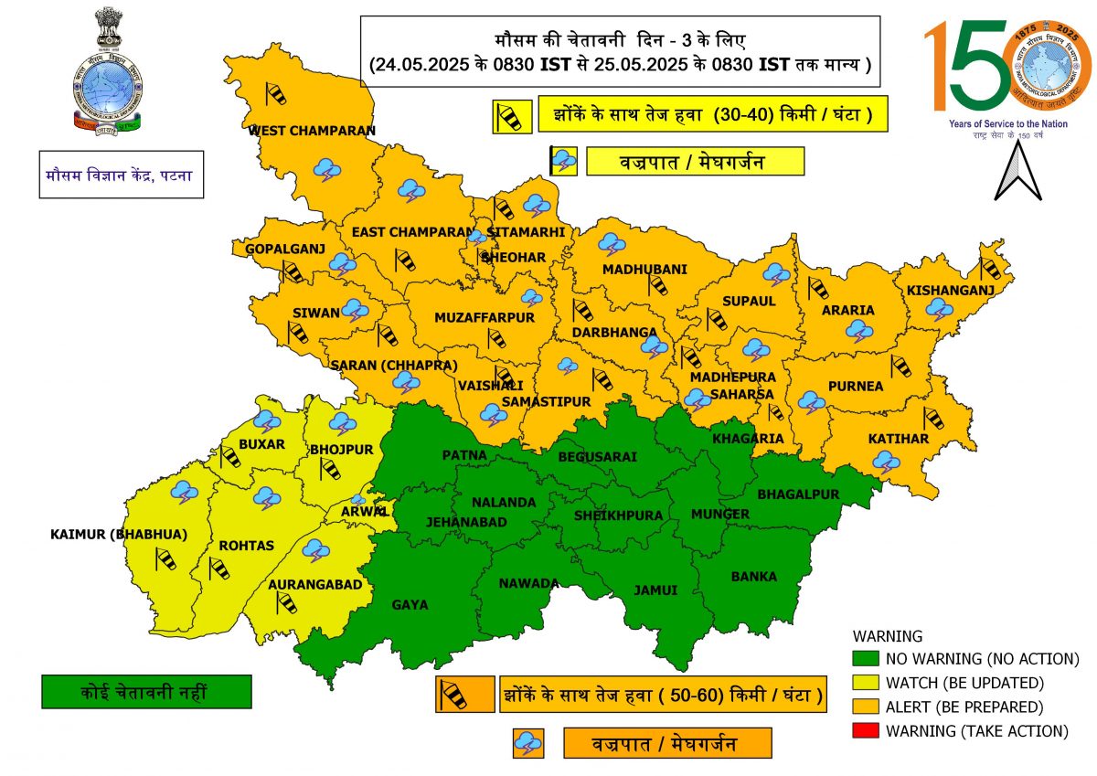 पटना मौसम विज्ञान केंद्र ने बताया कि 3 मई को बिहार के कई जिलों में तेज हवाओं, गरज-चमक और बारिश की संभावना है. कुछ क्षेत्रों में ओलावृष्टि और आकाशीय बिजली गिरने की चेतावनी भी जारी की गई है. राज्य के उत्तरी और पूर्वी जिलों में तेज आंधी और बारिश की संभावना है. मधुबनी, सीतामढ़ी और दरभंगा में आकाशीय बिजली गिरने का रेड अलर्ट जारी किया गया है. अन्य जिलों में 60 किलोमीटर प्रति घंटे तक की तेज हवाएं चल सकती हैं.