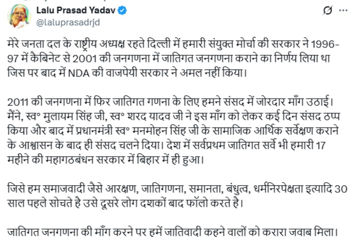 देश में पहली बार जातिगत सर्वे हमारी प्रशासन में हुआ: लालू यादव