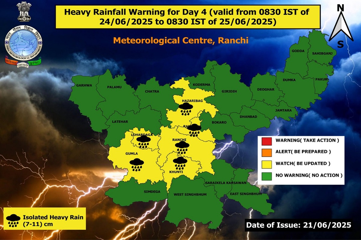 मौसम विभाग की माने तो, 24 जून से 26 जून तक राजधानी रांची सहित कई जिलों में वज्रपात के साथ भारी बारिश हो सकती है. इसे लेकर विभाग ने येलो अलर्ट जारी किया है. बुधवार को रांची, हजारीबाग, रामगढ़, खूंटी, लोहरदगा और गुमला में बारिश का अलर्ट जारी किया गया है. जबकि गुरुवार और शुक्रवार को रांची, रामगढ़, खूंटी, लोहरदगा, गुमला, सरायकेला-खरसावां, पूर्वी सिंहभूम, पश्चिमी सिंहभूम और सिमडेगा में बादल गरजने के साथ ही बारिश होगी.