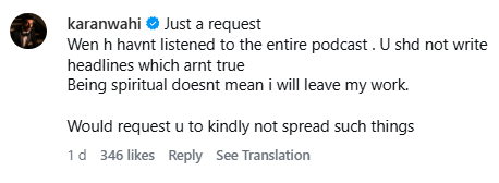 जब यह झूठ हद से ज्यादा बढ़ने लगा, तो करण वाही ने खुद चुप्पी तोड़ी. उन्होंने सोशल मीडिया पर इस अफवाह का स्क्रीनशॉट शेयर किया और नाराजगी जाहिर की. करण ने साफ कहा, “आध्यात्मिक होने का यह मतलब बिल्कुल नहीं है कि मैं अपना काम छोड़ दूं. सिर्फ व्यूज पाने के लिए झूठ मत फैलाइए.” उन्होंने गुजारिश की कि इस तरह की गलत समाचारें न फैलाई जाएं, क्योंकि वो अभी भी एक्टिंग कर रहे हैं.