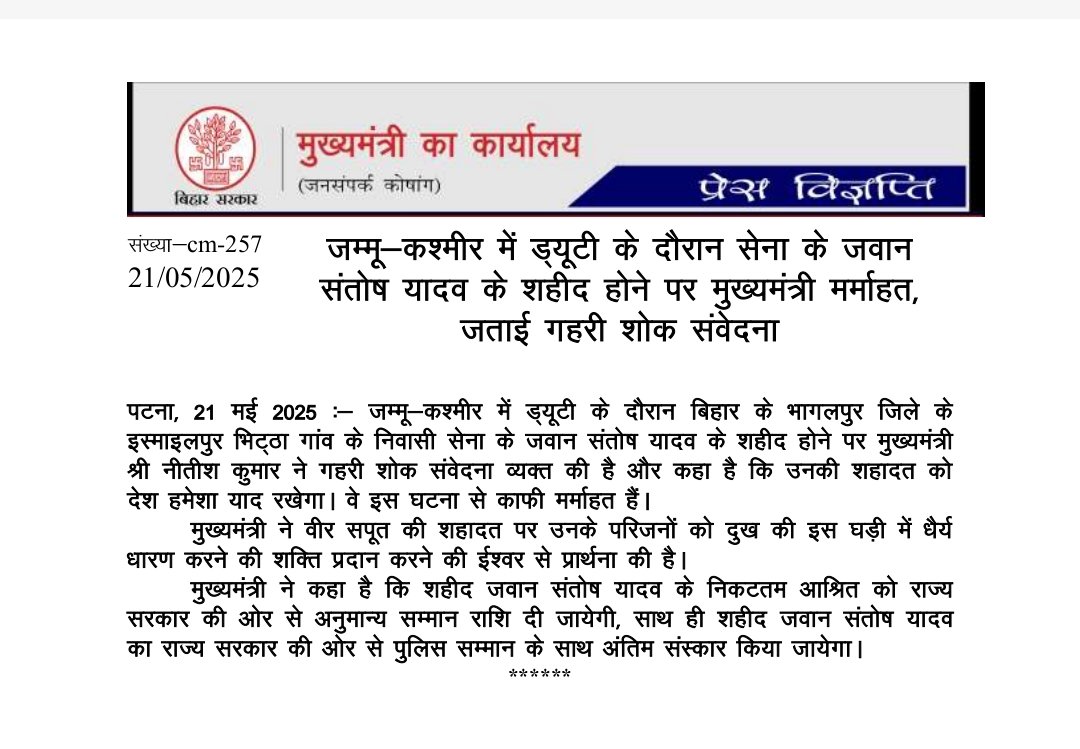 जवान संतोष की शहादत पर गहरी शोक संवेदना व्यक्त करते हुए सीएम नीतीश कुमार ने कहा कि उनके बलिदान को पूरा देश याद रखेगा. मुख्यमंत्री ने कहा कि शहीद के निकटतम आश्रित को राज्य प्रशासन की ओर से अनुमान्य सम्मान राशि दी जाएगी. पुलिस सम्मान के साथ शहीद को अंतिम संस्कार किया जाएगा.