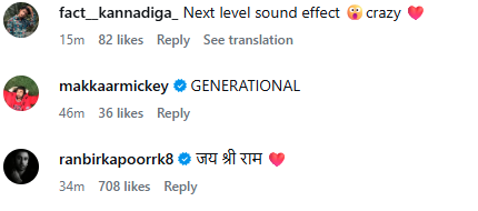वीडियो पर कमेंट करते हुए एक यूजर fact__kannadiga ने लिखा, नेक्सट लेवल का साउंड इफेक्ट. जबरदस्त. यूजर thename_is_vicky ने लिखा, हमें रावण का इंतजार है. यूजर uniquedhavalkhatri ने लिखा, सचमुच रोंगटे खड़े हो गए.